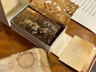 എഡിൻബർഗിലെ ഹോളിറൂഡ് ഹൌസിലെ ഹൌസ് കീപ്പറായ മാരിയൺ പോൾസണിണിന്റെ സേവനങ്ങൾക്കുള്ള നന്ദി സൂചകമായി സമ്മാനമായാണ് ബക്കിംഗ്ഹാം കൊട്ടാരത്തിൽ നിന്നും രാജകീയ ദമ്പതികളുടെ പ്രത്യേക സമ്മാനമായി കേക്ക് കഷണം അയച്ചു കൊടുത്തത്. 1980ൽ മരിക്കുന്നതു വരെ മാരിയൺ പോൾസൺ കേക്ക് കഷണം സൂക്ഷിച്ചു വച്ചു. മാരിയൻ പോൾസിന്റെ കട്ടിലിനടിയിൽ നിന്നാണ് കേക്കിന്റെ കഷണം കണ്ടെത്തിയത് അതിനോടൊപ്പം തന്നെ എലിസബത്ത് രാജ്ഞി പോൾസണിനെഴുതിയ ഒരു കത്തും കണ്ടെത്തിയിരുന്നു. പോൾസണിന്റെ ഡെസേർട്ട് സർവീസിനെ പ്രശംസിച്ചു കൊണ്ടുള്ള കത്ത് ആയിരുന്നു അത്. പോൾസണിന്റെ സേവനങ്ങളിൽ ഇരുവരും വളരെയധികം സന്തോഷിക്കുന്നെന്ന് രാജ്ഞി കത്തിലെഴുതി.