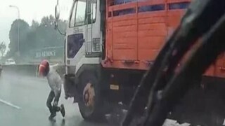 വീഡിയോയില് ഒരു മോട്ടോര് സൈക്കിള് യാത്രക്കാരന് (biker) സ്പീഡില് വരുന്നത് കാണാം. തുടര്ന്ന് ബാലന്സ് നഷ്ടപ്പെട്ട ബൈക്ക് റോഡിലൂടെ തെന്നി നീങ്ങുകയും വീഴുകയും ചെയ്യുന്നുണ്ട്. തൊട്ടുപിന്നാലെ ഒരു ട്രക്ക് വന്ന് ബൈക്കിന് മുകളിലൂടെ കടന്നു പോകുന്നത് കാണാം. ഞൊടിയിട വ്യത്യാസത്തില് ബൈക്ക് യാത്രികന് വീണിടത്തു നിന്ന് എഴുന്നേറ്റ് അല്പ്പം ദൂരേക്ക് മാറി നില്ക്കുന്നതും വീഡിയോയില് കാണാം. കോരിച്ചൊരിയുന്ന മഴയ്ക്കിടയിലായിരുന്നു ഈ അപകടം നടന്നത്. ഒരു കാര് വൈപ്പര് ആണ് ആദ്യം വീഡിയോയില് കാണാന് കഴിയുന്നത്. കാറില് യാത്ര ചെയ്യുന്ന ഒരു യാത്രക്കാരനാണ് ഈ പേടിപ്പെടുത്തുന്ന അപകട വീഡിയോ പകര്ത്തിയത്. നിസ്സഹായനായ ട്രെക്ക് ഡ്രൈവര് എങ്ങനെയോ ട്രക്ക് നിര്ത്തുന്നുമുണ്ട്. പതിയെ ബൈക്ക് യാത്രികന് ബൈക്കിന് കേടുപാട് സംഭവിച്ചിട്ടുണ്ടോയെന്ന് പരിശോധിക്കാന് പോകുന്നതുമാണ് വീഡിയോയില് അവസാനമായി കാണാന് കഴിയുന്നത്.