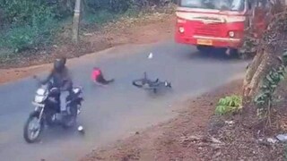അതിവേഗത്തില് റോഡിലേക്ക് പാഞ്ഞെത്തി, ആദ്യം ബൈക്കില് ഇടിച്ച ശേഷം കുട്ടിയും സൈക്കിളും റോഡിലേക്ക് തെറിച്ചുവീഴുന്നു. തുടര്ന്ന് തൊട്ടുപിറകേ വരുന്ന കെഎസ്ആര്ടിസി ബസ് സൈക്കിളിനു മുകളിലൂടെ കയറിയിറങ്ങുന്നു.