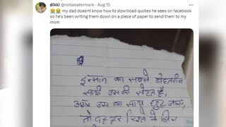 എക്സ് പ്ളാറ്റ്ഫോമിലാണ് പോസ്റ്റ് പ്രത്യക്ഷപ്പെട്ടത്. ഹിന്ദിയിലാണ് പോസ്റ്റ്. ”ഫേസ്ബുക്കിൽ കാണുന്ന പോസ്റ്റുകൾ എങ്ങനെ ഡൗൺലോഡ് ചെയ്യണമെന്ന് എന്റെ അച്ഛന് അറിയില്ല, ഈ കുറിപ്പ് എന്റെ അമ്മയ്ക്ക് അയയ്ക്കാൻ അദ്ദേഹം ഒരു കടലാസിലേക്ക് പകർത്തി എഴുതിയിരിക്കുകയാണ്”, എന്നാണ് പോസ്റ്റിൽ പറഞ്ഞിരിക്കുന്നത്.