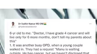 ആ ആറുവയസ്സുകാരനെ പരിചയപ്പെട്ടത് മുതലുള്ള കാര്യങ്ങള് ഡോക്ടര് കുറിപ്പിലെഴുതിയിരുന്നു. തിരക്കുള്ള ഒരു ദിവസം ഒരു ദമ്പതികള് തന്നെ കാണാനെത്തിയിരുന്നുവെന്നും തങ്ങളുടെ മകന് കാന്സര് രോഗമാണെന്നും നാലാം സ്റ്റേജിലാണെന്നും പറഞ്ഞു. എന്നാല് ഈ രോഗവിവരങ്ങളൊന്നും കുട്ടിയോട് പറയരുതെന്ന് അവര് തന്നോട് പറഞ്ഞു. ചികിത്സ ചെയ്താല് മാറുമെന്ന് കുട്ടിയെ പറഞ്ഞ് വിശ്വസിപ്പിക്കണമെന്നും ആ മാതാപിതാക്കള് തന്നോട് പറഞ്ഞുവെന്ന് ഡോക്ടര് കുറിച്ചു.
