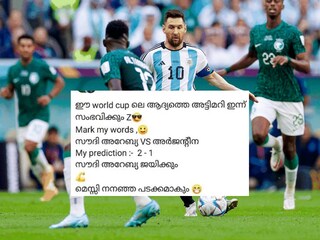 വേള്ഡ് മലയാളി സര്ക്കിള് എന്ന ഗ്രൂപ്പിലാണ് മധു മണക്കാട്ടില് എന്ന യുവാവാണ് പ്രവചനം നടത്തിയത്.പ്രവചനം ഇങ്ങനെ: ഈ world cup ലെ ആദ്യത്തെ അട്ടിമറി ഇന്ന് സംഭവിക്കും Mark my words സൗദി അറേബ്യ VS അർജന്റീന. My prediction :- 2-1 സൗദി അറേബ്യ ജയിക്കും. മെസ്സി നനഞ്ഞ പടക്കമാകും.