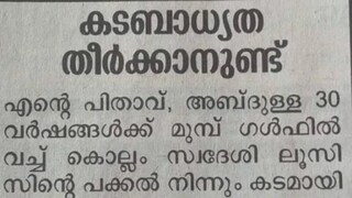 ഇപ്പോഴത്തെ മൂല്യമനുസരിച്ച് 22,000 രൂപയേ നൽകാനുളളൂവെങ്കിലും ബാപ്പയുടെ ആഗ്രഹത്തിന് അതിലും എത്രയോ മടങ്ങ് മൂല്യമുണ്ടെന്ന് അബ്ദുള്ളയുടെ കുടുംബത്തിന് അറിയാം. നാസർ ഉൾപ്പെടെ 7 മക്കളാണുള്ളത്. ലൂയിസിനെയോ സഹോദരൻ ബേബിയെയോ കണ്ടെത്താനായി വീണ്ടും പത്രത്തിൽ പരസ്യം നൽകിയിരിക്കുകയാണ് നാസർ. ഫോൺ 7736662120.