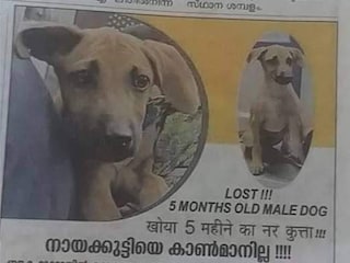 നായയെ കണ്ടെത്താൻ സഹായിക്കുന്ന അടയാളങ്ങളും നൽകിയിട്ടുണ്ട്. തിരിച്ചറിയൽ മൈക്രോചിപ്പ് ഘടിപ്പിച്ചിട്ടുണ്ട്. ബ്രൗൺ നിറമാണ് നായക്കുട്ടിക്ക്. ലൈറ്റ് ബ്രൗൺ നിറത്തിലെ കണ്ണുകളുമുണ്ട്. നീല നിറത്തിലുള്ള ബെൽറ്റ് കഴുത്തിലുണ്ട്. ഫോൺ നമ്പർ സഹിതമാണ് നായക്കുട്ടിടെയ കണ്ടെത്താനുള്ള പത്ര പരസ്യം വന്നിരിക്കുന്നത്.