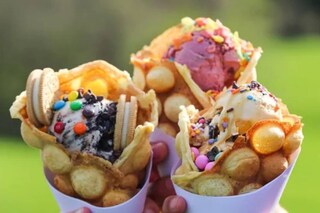 വിക്കി ഒരു ബബിൾ വാഫിൾ ഐസ്ക്രീം, കിന്റർ ബ്യൂണോ സോസ്, വിപ്പ് ക്രീം, ഒരു ലോട്ടസ് ബിസ്കോഫ് ബിസ്കറ്റ്, ബിസ്കോഫ് സോസ് എന്നിവയാണ് ഡോളീസ് ഡെസേർട്ട്സിൽ നിന്ന് ഓർഡർ ചെയ്തത്.