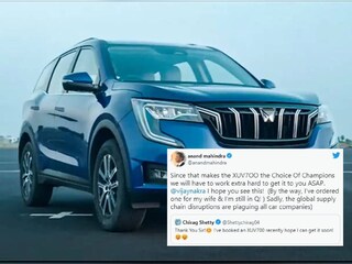 'അക്കാരണം കൊണ്ട് എക്സ്യുവി-700 ചാമ്പ്യന്മാർ തിരഞ്ഞെടുക്കുന്ന വാഹനമായി മാറിയിരിക്കുന്നു. എത്രയും പെട്ടെന്ന് തന്നെ വാഹനം നിങ്ങളിലേക്ക് എത്തിക്കാൻ ശ്രമിക്കും. ഒരു കാര്യം കൂടി പറയട്ടെ, ഞാൻ എന്റെ ഭാര്യക്കായി ഒരു മഹീന്ദ്ര എക്സ്യുവി-700 ബുക്ക് ചെയ്തിട്ടുണ്ട്. അത് ഇപ്പോഴും ക്യൂവിലാണ്. ആഗോള വിതരണ ശ്ര൦ഖല നേരിട്ടിട്ടുള്ള തടസ്സങ്ങൾ എല്ലാ വാഹന കമ്പനികളെയും ബാധിച്ചിട്ടുണ്ട്. പ്രശ്നം പെട്ടെന്ന് തന്നെ പരിഹരിക്കാൻ ശ്രമിക്കുന്നതായിരിക്കും.' - ആനന്ദ് മഹീന്ദ്ര മറുപടി നൽകി.