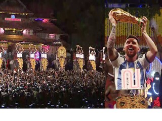 പൂരപ്പറമ്പില് 'മിശിഹ' ഉയർന്നു; കുടമാറ്റത്തിൽ മെസിയെ ഉയർത്തി തിരുവമ്പാടിയുടെ സർപ്രൈസ്