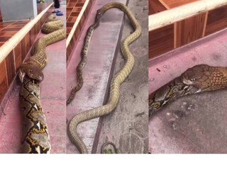പെരുമ്പാമ്പിനെ വരിഞ്ഞുമുറുക്കി ഒന്നോടെ വിഴുങ്ങി രാജവെമ്പാല; വൈറൽ വീഡിയോ