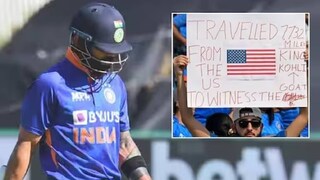 ഈ സമയത്ത് സ്റ്റേഡിയത്തില് ഒരു പോസ്റ്റര് ഉയര്ത്തി വിരാട് ആരാധകന് കുറിച്ച വാക്കുകളാണ് ഇപ്പോള് വൈറലാകുന്നത്. 12000 കിലോമീറ്റര് താണ്ടി യുഎസില് നിന്നും ഇന്ത്യയിലെത്തിയ വിരാട് ആരാധകനാണ് ഈയൊരു പോസ്റ്റര് ഉയര്ത്തി കാണിച്ചത്. കോഹ്ലിയുടെ അത്യുജ്ജ്വല പ്രകടനം കാണാന് ലക്നൗവിലെ ഏകാന സിറ്റി സ്പോര്ട്സ് സ്റ്റേഡിയത്തിലെത്തിയ ഇദ്ദേഹത്തിന് ഡെക്കിന് പുറത്തായ കോഹ്ലിയെയാണ് കാണാനായത്.