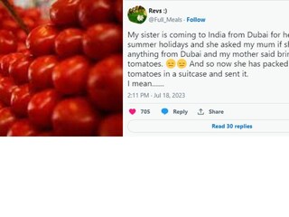 ഈ സാഹചര്യത്തിലാണ് യുഎഇയില് നിന്ന് എന്താണ് വാങ്ങേണ്ടതെന്ന് മകള് അമ്മയോട് ചോദിച്ചത്. ദുബായില് താമസിക്കുന്ന മകളോട് തനിക്ക് സമ്മാനമായി 10 കിലോ തക്കാളി കൊണ്ടുവന്നാല് മതിയെന്നാണ് ഈ അമ്മ ആവശ്യപ്പെട്ടത്.