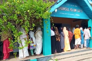 സി പി എമ്മിന്റെ ചിഹ്നമായ ചുറ്റിക അരിവാൾ നക്ഷത്രം പതിച്ച മാസ്കുമായി എത്തിയ പ്രിസൈഡിംഗ് ഓഫീസറെ മാറ്റി. യു ഡി എഫിന്റെ പരാതിയെ തുടർന്ന് ഉദ്യോഗസ്ഥയെ മാറ്റുകയായിരുന്നു.