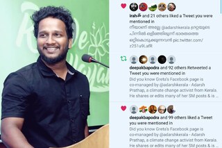 ''കാലാവസ്ഥാ വ്യതിയാനത്തെ കുറിച്ചുള്ള യു എൻ സമ്മേളനത്തിൽ വെച്ചാണ് ഗ്രേറ്റയെ പരിചയപ്പെടുന്നത്. അതിനുശേഷം ഫ്രേഡേഴ്സ് ഫോർ ഫ്യൂച്ചർ എന്ന പേരിൽ ലോകവ്യാപകായി കാലാവസ്ഥാ വ്യതിയാനത്തിരെ പ്രതിഷേധങ്ങൾ നടക്കുന്നുണ്ടായിരുന്നു. ഈ ഘട്ടത്തിൽ അവരുടെ അവരുടെ അഭിപ്രായം പോസ്റ്റ് ചെയ്യുന്നതിനാണ് ഫേസ്ബുക്ക് പേജ് തുടങ്ങിയത്. ഇപ്പോൾ പേജിലെ ഫോളോവേഴ്സിന്റെ എണ്ണം വർധിച്ചു. ഗ്രേറ്റയുടെ പോസ്റ്റ് റീ പോസ്റ്റ് ചെയ്യുന്നത് ഇപ്പോഴും തുടരുന്നു. കാലാവസ്ഥാ വ്യതിയാനത്തിന്റെ സന്ദേശം ലോകം മുഴുവൻ എത്തിക്കുക എന്നുള്ളതാണ് പ്രധാന ഉദ്ദേശ്യം. ബാക്കി കാര്യങ്ങളിലുള്ള ഗ്രേറ്റയുടെ അഭിപ്രായം വ്യക്തിപരമാണ്. തനിക്ക് അതിൽ യാതൊരു പങ്കുമില്ല''- ആദർഷ് ന്യൂസ് 18നോട് പറഞ്ഞു.