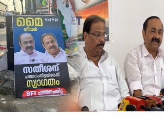 സതീശന് പത്തനംതിട്ടയിലേക്ക് സ്വാഗതം എന്ന വാചകത്തിനൊപ്പം രണ്ട് നേതാക്കളുടെയും ചിത്രം സഹിതമാണ് എസ്എഫ്ഐ പത്തനംതിട്ട ഗാന്ധി സ്ക്വയറില് ഫ്ലക്സ് ബോര്ഡ് സ്ഥാപിച്ചത്. കെപിസിസി നേതൃത്വത്തിന്റെ സമരാഗ്നി ജാഥയുടെ ഭാഗമായി കെ.സുധാകരനും വി.ഡി സതീശനും അടുത്തദിവസം പത്തനംതിട്ടയിലെത്തുന്നുണ്ട്. അതേസമയം, ഫ്ലക്സ് ബോർഡ്