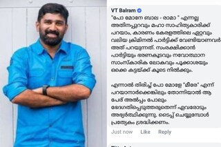 ഇതിനു മറുപടിയുമായെത്തിയ ബല്റാം 'പോ മോനേ ബാല - രാമാ ' എന്നല്ല അതിനപ്പുറവും മഹാ സാഹിത്യകാരിക്ക് പറയാം, കാരണം കേരളത്തിലെ ഏറ്റവും വലിയ ക്രിമിനല് പാര്ട്ടിക്ക് വേണ്ടിയാണവര് അത് പറയുന്നത്. സംരക്ഷിക്കാന് പാര്ട്ടിയും ഭരണകൂടവും നവോത്ഥാന സാംസ്കാരിക ലോകവും പൂക്കാശയും ഒക്കെ കട്ടയ്ക്ക് കൂടെ നില്ക്കും. എന്നാല് തിരിച്ച് പോ മോളേ ''മീരേ' എന്ന് പറയാനാര്ക്കെങ്കിലും തോന്നിയാല് ആ പേര് അല്പ്പം പോലും ഭേദഗതിപ്പെടുത്തരുതെന്ന് ഏവരോടും അഭ്യര്ത്ഥിക്കുന്നു. ടൈപ്പ് ചെയ്യുമ്പോള് പ്രത്യേകം ശ്രദ്ധിക്കണം.' എന്നായിരുന്നു പോസ്റ്റിനു കീഴെ കുറിച്ചത്.