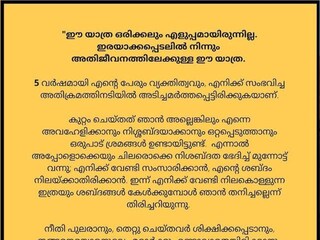 നീതി പുലരാനും, തെറ്റു ചെയ്തവർ ശിക്ഷിക്കപെടാനും ഇങ്ങനെയൊരനുഭവം മറ്റാർക്കും ഉണ്ടാവാതെയിരിക്കാനും ഞാൻ ഈ യാത്ര തുടർന്ന് കൊണ്ടേയിരിക്കും. കൂടെ നിൽക്കുന്ന എല്ലാവരുടേയും സ്നേഹത്തിനു ഹൃദയം നിറഞ്ഞ നന്ദി"