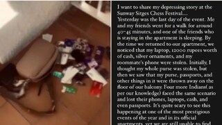 അതേസമയം സമാനമായ പരാതിയുമായി ചെസ്സ് താരമായ മൗനിക അക്ഷയയും രംഗത്തെത്തി. അപ്പാര്ട്ട്മെന്റില് നിന്ന് 12000 രൂപയും, കുറച്ച് വെള്ളി ആഭരണങ്ങളും നഷ്ടമായെന്ന് മൗനിക പറഞ്ഞു. തന്റെ റൂംമേറ്റിന്റെ ഫോണും മോഷ്ടിക്കപ്പെട്ടുവെന്നും ഇവര് പറഞ്ഞു. '' ആദ്യം കരുതിയത് എന്റെ പേഴ്സ് മോഷണം പോയെന്നാണ്. എന്നാല് പേഴ്സ്, പാസ്പോര്ട്ട്, അതിലുണ്ടായിരുന്ന മറ്റ് രേഖകകള് എന്നിവയെല്ലാം ബാല്ക്കണിയിലെ തറയില് ചിതറിക്കിടക്കുകയായിരുന്നു. സംഘാടകര് നല്കിയ സുരക്ഷാ സംവിധാനങ്ങളുള്ള അപ്പാര്ട്ട്മെന്റിലാണ് മോഷണം നടന്നിരിക്കുന്നത്. എന്നാൽ ആരാണ് ഇത് ചെയ്തതെന്ന് കണ്ടെത്താന് പോലുമായിട്ടില്ല,'' എന്നും മൗനിക പറഞ്ഞു.