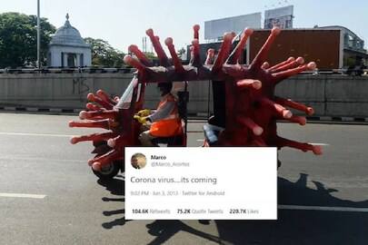 2013-ൽ ട്വിറ്ററിലെ സാധാരണ ഉപയോക്താക്കളിൽ ഒരാൾ പോസ്റ്റ് ചെയ്ത ഒരു ട്വീറ്റ് ഇപ്പോൾ വൈറലായിക്കൊണ്ടിരിക്കുകയാണ്. എട്ട് വർഷങ്ങൾക്ക് മുമ്പ് പോസ്റ്റ് ചെയ്ത ആ ട്വീറ്റ്ഇങ്ങനെയായിരുന്നു: "കൊറോണ വൈറസ്... അത് വരുന്നുണ്ട്.".@Marco_Acorte എന്ന ട്വിറ്റർ ഹാൻഡിലിൽ നിന്നാണ് അത്ഭുതകരമായ ഈ ട്വീറ്റ്പോസ്റ്റ് ചെയ്തിട്ടുള്ളത്. കൊറോണ വൈറസുകളുടെ പൊതുവായ ഗ്രൂപ്പിനെക്കുറിച്ചാണ് ആ ട്വീറ്റ് പരാമർശിക്കുന്നതെന്നും അല്ലാതെ കോവിഡ് 19-നെക്കുറിച്ച് സവിശേഷമായിഅല്ലെന്നുമുള്ള വിശദീകരണമാണ് ഈ ട്വീറ്റിന് പ്രായോഗികമായി നൽകാൻ കഴിയുക. കഴിഞ്ഞ വർഷം കോവിഡ് വ്യാപനം ആരംഭിച്ച ഘട്ടത്തിലും ഈ ട്വീറ്റ് ശ്രദ്ധ നേടിയിരുന്നു. എന്തായാലും ട്വിറ്ററിൽ ഒരു ട്വീറ്റിന്റെ തീയതി തിരുത്താനോ മറ്റൊരു തീയതിയിൽ പോസ്റ്റ് ചെയ്തതായി കാണിക്കാനോ ഒന്നും കഴിയില്ല.