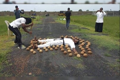 കറുത്ത തുണി കൊണ്ട് കണ്ണുമൂടിയെത്തിയ ശിഷ്യൻ, കൃത്യമായ നിര പാലിച്ച് ചുറ്റിക ഉപയോഗിച്ച് തേങ്ങകൾ അടിച്ചു പൊട്ടിക്കുകയായിരുന്നു.