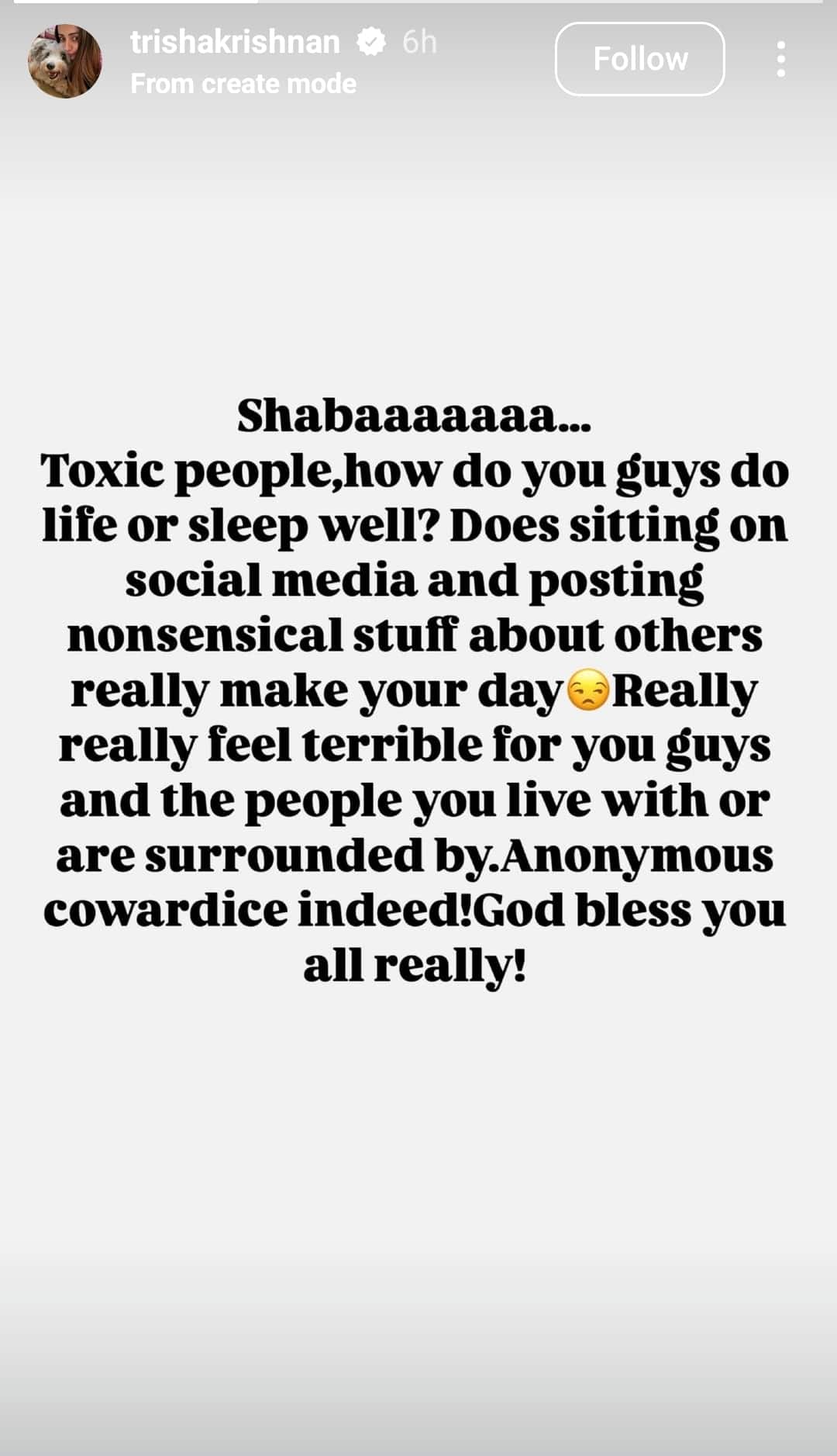തൃഷ തന്റെ ഇൻസ്റ്റാഗ്രാം അക്കൗണ്ടിൽ പങ്കുവച്ച സ്റ്റോറിയുടെ പൂർണരൂപം ഇങ്ങനെ,''ടോക്സിക് മനുഷ്യരെ, നിങ്ങൾ എങ്ങിനെയാണ് ജീവിതം മുന്നോട്ട് നയിക്കുന്നത്. അല്ലെങ്കിൽ, എങ്ങിനെയാണ് സമാധാനത്തോടെ ഉറങ്ങുന്നത്. സാമൂഹ്യമാധ്യമങ്ങളിൽ ഇരുന്നുകൊണ്ട് മറ്റുള്ളവരെക്കുറിച്ച് അർഥശൂന്യമായ കാര്യങ്ങൾ പങ്കുവയ്ക്കുന്നത് നിങ്ങളുടെ ജീവിതത്തെ മനോഹരമാക്കുന്നുണ്ടോ. നിങ്ങളേയും നിങ്ങൾക്കൊപ്പം താമസിക്കുന്നവരേയും ചുറ്റിപ്പറ്റിയുള്ളവരെയും ഓർത്ത് വിഷമമുണ്ട്. ഒളിച്ചിരിക്കുന്ന ഭീരുക്കളാണ് നിങ്ങൾ. ദൈവം അനുഗ്രഹിക്കട്ടെ', താരം കുറിച്ചു.