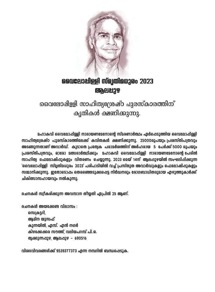 വൈലോപ്പിള്ളി സ്മൃതി മധുരം 2023 എന്ന പേരില് ഏര്പ്പെടുത്തിയിരിക്കുന്ന സാഹിത്യശ്രേഷ്ഠ പുരസ്കാരത്തിലേക്കായി കവിതകള് ക്ഷണിച്ചുകൊണ്ടാണ് സംഘാടകര് നോട്ടീസ് ഇറക്കിയത്