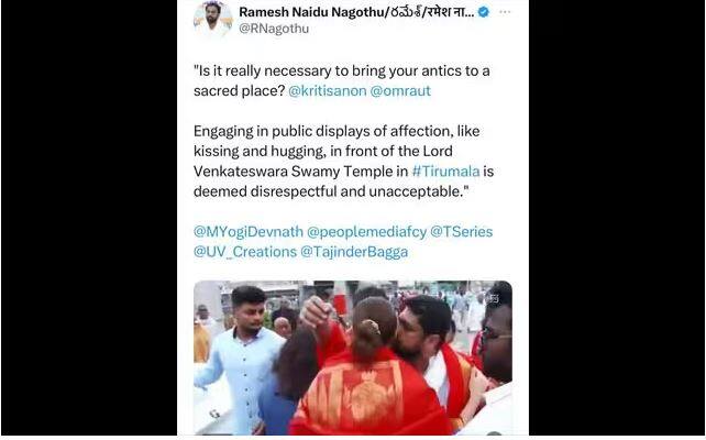 വീഡിയോ കണ്ട ബിജെപി സംസ്ഥാന സെക്രട്ടറി രമേശ് നായിഡു നഗോത്തു സംവിധായകന് ഓം റാവത്തിനും കൃതി സനോണിനുമെതിരെ രംഗത്തെത്തി. ‘ ഒരു പവിത്രമായ സ്ഥലത്ത് ഇത്തരമൊരു പ്രവൃത്തിയുടെ ആവശ്യമുണ്ടായിരുന്നോ ? തിരുപ്പതി വെങ്കടേശ്വര സ്വാമി ക്ഷേത്രത്തിന് മുന്നില് കെട്ടിപിടിക്കുന്നതും ചുംബിക്കുന്നതും മര്യാദകേടും അംഗീകരിക്കാന് കഴിയാത്തതുമാണ്’ എന്ന് അദ്ദേഹം ട്വീറ്റ് ചെയ്തു.