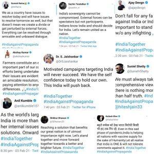 പോപ് ഗായിക രിഹാന, പരിസ്ഥിതി പ്രവര്ത്തക ഗ്രെറ്റ തുന്ബെര്ഗ് തുടങ്ങിയവരടക്കമുള്ള അന്താരാഷ്ട്ര സെലിബ്രിറ്റികള് കര്ഷക സമരം ട്വിറ്റർ ഉൾപ്പടെയുള്ള സമൂഹമാധ്യമങ്ങളിലൂടെ ഉയര്ത്തിയത് വലിയ ചർച്ചയായിരുന്നു. ഇതിനെതിരെ സർക്കാർ രംഗത്തെത്തിയിരുന്നു. തെറ്റായ വിഷയത്തിലുള്ള ഉള്ളടക്കങ്ങൾ നീക്കം ചെയ്യണമെന്ന സർക്കാർ നിർദേശം കർശനമായി പാലിക്കണമെന്ന് ആവശ്യപ്പെട്ട് ട്വിറ്ററിന് നോട്ടീസ് നൽകിയിരുന്നു. അതിന് പിന്നാലെയാണ് അന്താരാഷ്ട്ര സെലിബ്രിറ്റികളുടെ പ്രചരണം തടയിടാനായി കേന്ദ്ര വിദേശകാര്യ മന്ത്രാലയം 'ഇന്ത്യ എഗെയ്ന്സ്റ്റ് പ്രൊപ്പഗണ്ട' കാമ്പയിന് തുടങ്ങിയത്. മന്ത്രിമാർ തുടങ്ങിവെച്ച കാംപയിൻ പിന്നീട് രാജ്യത്തെ സെലിബ്രിറ്റികൾ ഏറ്റെടുക്കുകയായിരുന്നു.