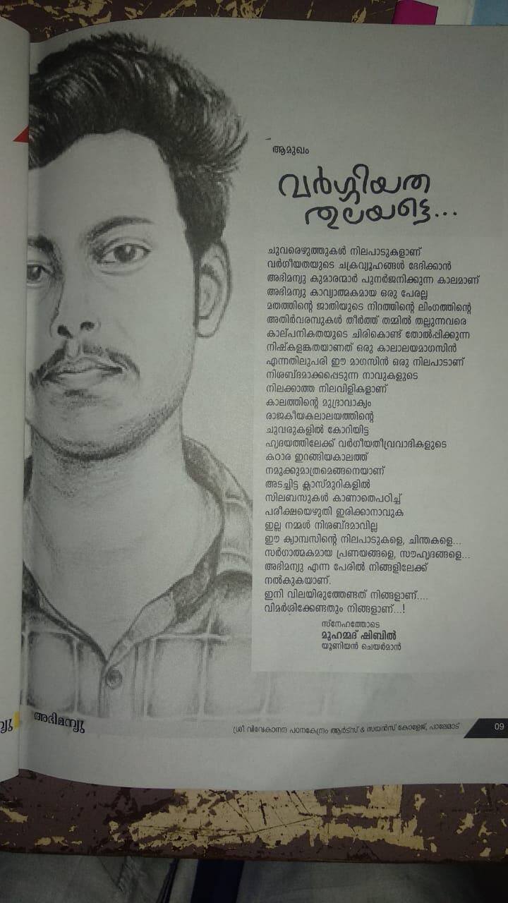 പാലേമാട് ശ്രീ വിവേകാനന്ദ കോളേജിലെ 2017-18 വർഷത്തെ കോളേജ് മാഗസിന് അഭിമന്യൂ എന്നാണ് പേരിട്ടത്. അഭിമന്യൂവിന്റെ കവർ ചിത്രത്തോടെ പ്രസിദ്ധീകരിച്ച കോളേജ് മാഗസിനിൽ വർഗീയത തുലയട്ടെ എന്ന പേരിൽ ലേഖനവുമുണ്ട്. ഇതുകൂടാതെ ഗൌരി ലങ്കേഷ്, ജിഷ്ണു പ്രണോയ് എന്നിവരെക്കുറിച്ചും മാഗസിനിൽ ഫീച്ചറുകളുണ്ട്.