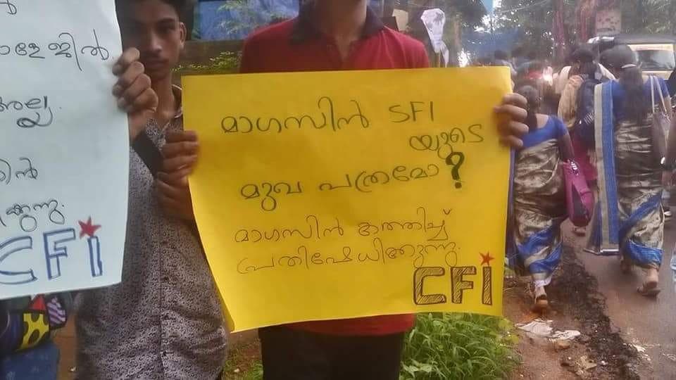 മാഗസിൻ കത്തിച്ച് പാലേമാട് ശ്രീ വിവേകാനന്ദ കോളേജിൽ കാംപസ് ഫ്രണ്ട് നടത്തിയ പ്രതിഷേധം