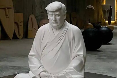 വെള്ള നിറമുള്ള ‘ട്രംപ്-ബുദ്ധ’ പ്രതിമ, ട്രംപ് ബുദ്ധനെപ്പോലെ ഇരിക്കുന്നതും മുഖം താഴ്ത്തി കൈകൾ മടിയിൽ ഇരിക്കുന്നതും ശാന്തമായ പ്രഭാവലയത്തിലുള്ളതാണ്