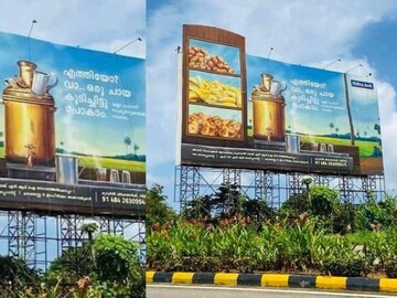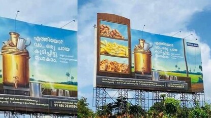 പരസ്യ ബോർഡിൽ പലഹാരങ്ങൾ നിറച്ച ചായക്കടയിലെ അലമാരയും ഉണ്ട്. ഈ പരസ്യമാണിപ്പോൾ സമൂഹമാധ്യമങ്ങളില് പ്രചരിക്കുന്നത്.