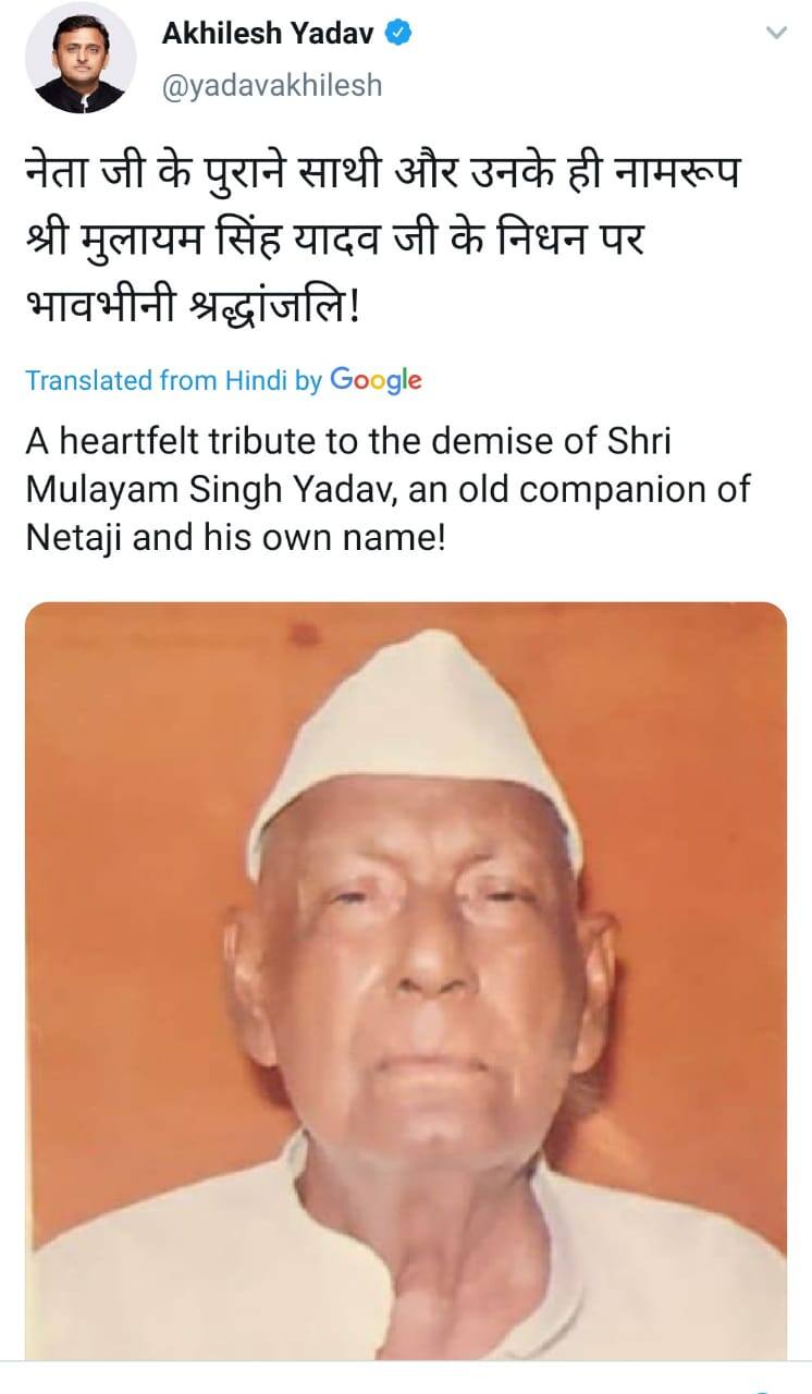 ലക്നൗ: സമാജ്വാദി പാര്ട്ടി നേതാവ് മുലായം സിങ് യാദവ് മരിച്ചുവെന്ന വാര്ത്തയും അദ്ദേഹത്തിന്റെ ഫോട്ടോയും സമൂഹ മാധ്യമങ്ങളിൽ വ്യാപകമായി പ്രചരിക്കുകയാണ്. എന്നാല് സമാജ്വാദി പാര്ട്ടി സ്ഥാപകനും അഖിലേഷ് യാദവിന്റെ അച്ഛനുമായ മുലായം സിങ് യാദവല്ല മരിച്ചത്. മരിച്ചത് സമാജ്വാദി പാര്ട്ടിയിലെ തന്നെ മറ്റൊരു മുതിര്ന്ന നേതാവും 92 വയസുകാരനുമായ മുലായം സിങ് യാദവാണ്.