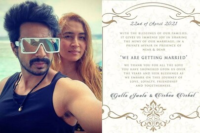 'ഞങ്ങൾ വിവാഹിതരാവുകയാണ്. സ്നേഹത്തിന്റെയും സൗഹൃദത്തിന്റയും ഒരുമയുടെയും പുതിയ യാത്രക്കൊരുങ്ങുന്ന ഈ വേളയിൽ നിങ്ങൾ തന്ന സ്നേഹത്തിനും അനുഗ്രഹങ്ങൾക്കും എല്ലാവിധ നന്ദിയും അറിയിക്കുന്നു' - സമൂഹ മാധ്യമങ്ങളിൽ പങ്കുവെച്ച പോസ്റ്റിൽ ജ്വാല ഗുട്ട കുറിച്ചു.