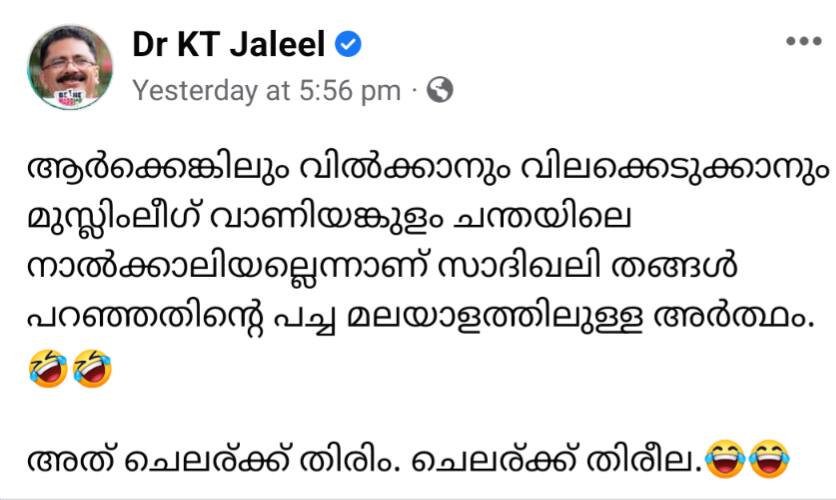 “ആർക്കെങ്കിലും വിൽക്കാനും വിലക്കെടുക്കാനും മുസ്ലിംലീഗ് വാണിയങ്കുളം ചന്തയിലെ നാൽക്കാലിയല്ലെന്നാണ് സാദിഖലി തങ്ങൾ പറഞ്ഞതിൻ്റെ പച്ച മലയാളത്തിലുള്ള അർത്ഥം. 🤣🤣