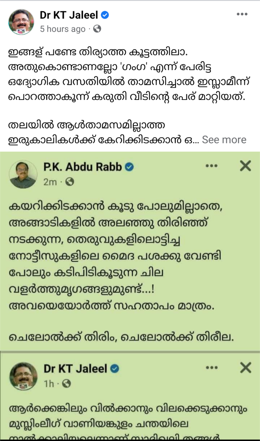 പണ്ട് റബ്ബ് മന്ത്രിയായപ്പോൾ ഔദ്യോഗിക വസതിയുടെ പേര് മാറ്റിയ സംഭവം ഓർമിപ്പിച്ച് ആയിരുന്നു ജലീലിൻ്റെ പരിഹാസം.. വൈകിയില്ല റബ്ബ് വക വന്നു അടുത്ത പോസ്റ്റ്. അത് അല്പം ഗൗരവത്തിൽ, കുറച്ചധികം നീളത്തിൽ വിശദമായി തന്നെ ഉള്ളത് ആണ്. ആ ഫേസ്ബുക് കുറിപ്പ് ഇങ്ങനെ.