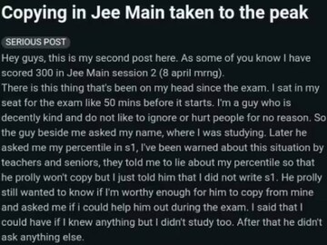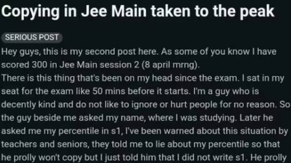 It seems a boy scored 300/300 in JEE Mains just by copying a topper sitting beside him.