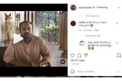 നടൻ സൗബിൻ ഷാഹിറിന്റെ ഇൻസ്റ്റഗ്രാം പോസ്റ്റിന് താഴെയാണ് നെറ്റ് ഫ്ലിക്സ് ഇന്ത്യയുടെ കമന്റ് പ്രത്യക്ഷപ്പെട്ടത്. 'ഇരുൾ' എന്ന പുതിയ ചിത്രത്തിന്റെ പ്രമോഷനുമായി ബന്ധപ്പെട്ട ഒരു വീഡിയോ ആണ് സൗബിൻ പങ്കു വച്ചിരിക്കുന്നത്. ഇൻസ്റ്റഗ്രാമിൽ സൗബിൻ പങ്കുവച്ച വീഡിയോയ്ക്ക് താഴെയാണ് 'ഫോൺ എ ഫ്രണ്ട് ചെയ്യാമോ?' എന്ന അപേക്ഷയുമായി നെറ്റ് ഫ്ലിക്സ് എത്തിയത്.