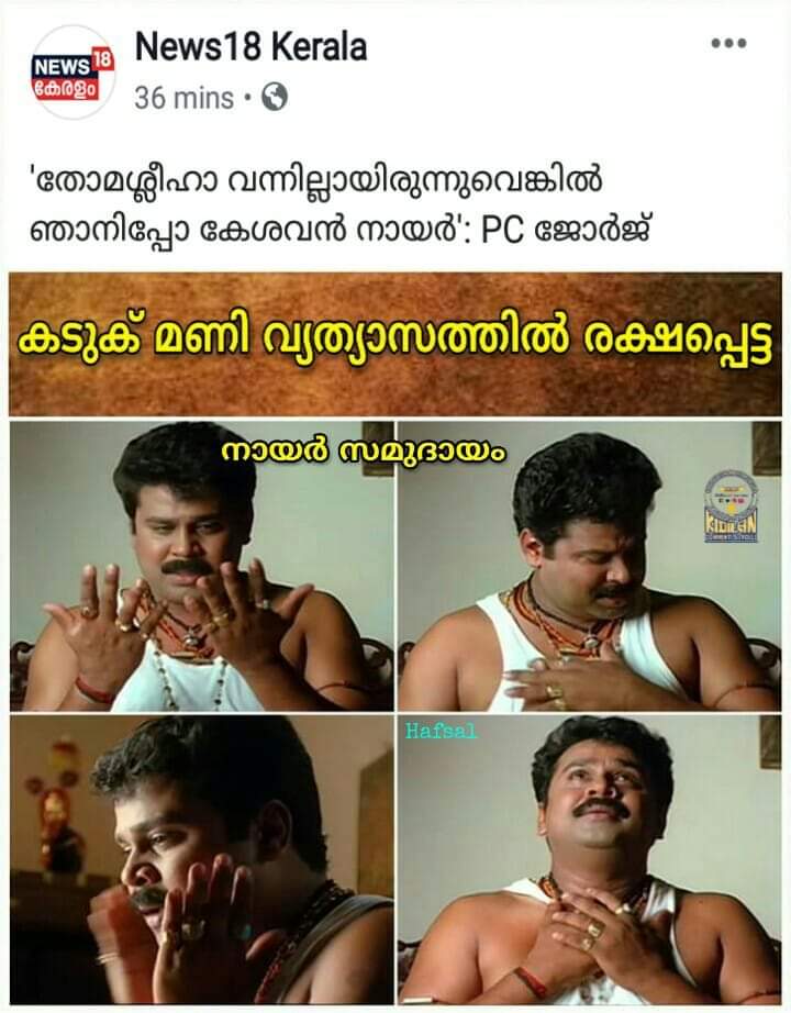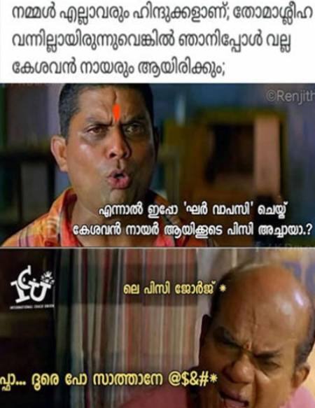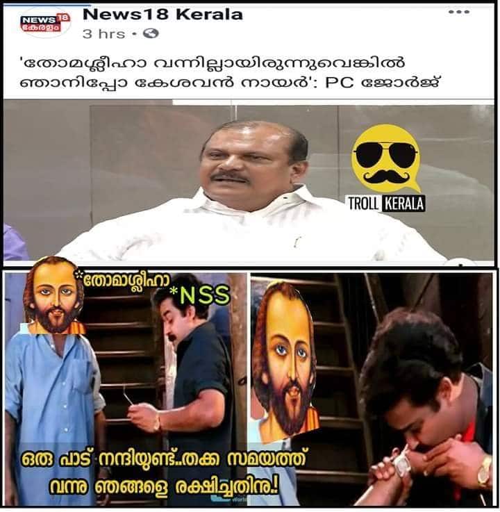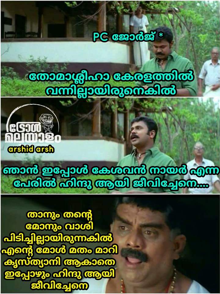 'നമ്മള് എല്ലാവരും ഹിന്ദുക്കളാണ്. തോമാശ്ലീഹ വന്നില്ലായിരുന്നുവെങ്കില് ഞാനിപ്പോ വല്ല കേശവന് നായരും ആയിരിന്നിരിക്കും..'- പി സി ജോര്ജിന്റെ ഈ വാക്കുകളാണ് ട്രോളന്മാർ ഏറ്റെടുത്തിരിക്കുന്നത്
