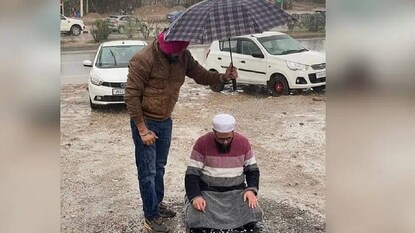 കാശ്മീരിൽ ആലിപ്പഴം വീഴുന്നത് വക വയ്ക്കാതെ നിസ്ക്കരിക്കുന്നയാൾക്ക് കുടപിടിച്ച് സിഖുകാരന്