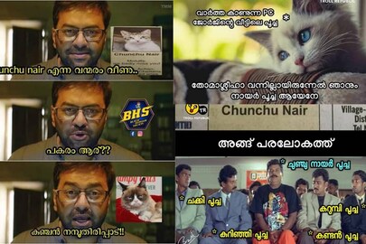 ചുഞ്ചു നായര് എന്ന വന്മരം വീണു. പകരം ആരെന്ന ചോദ്യമാണ് ട്രോളന്മാര് ഉയര്ത്തുന്നത്. ആദ്യമായി പത്രത്തില് പടം അച്ചടിച്ചു വന്ന ചുഞ്ചുവിനോട് മറ്റു പൂച്ചകള് അസൂയപ്പെടുന്നതും ട്രോളന്മാര് ഭാവനയില് കണ്ടു.