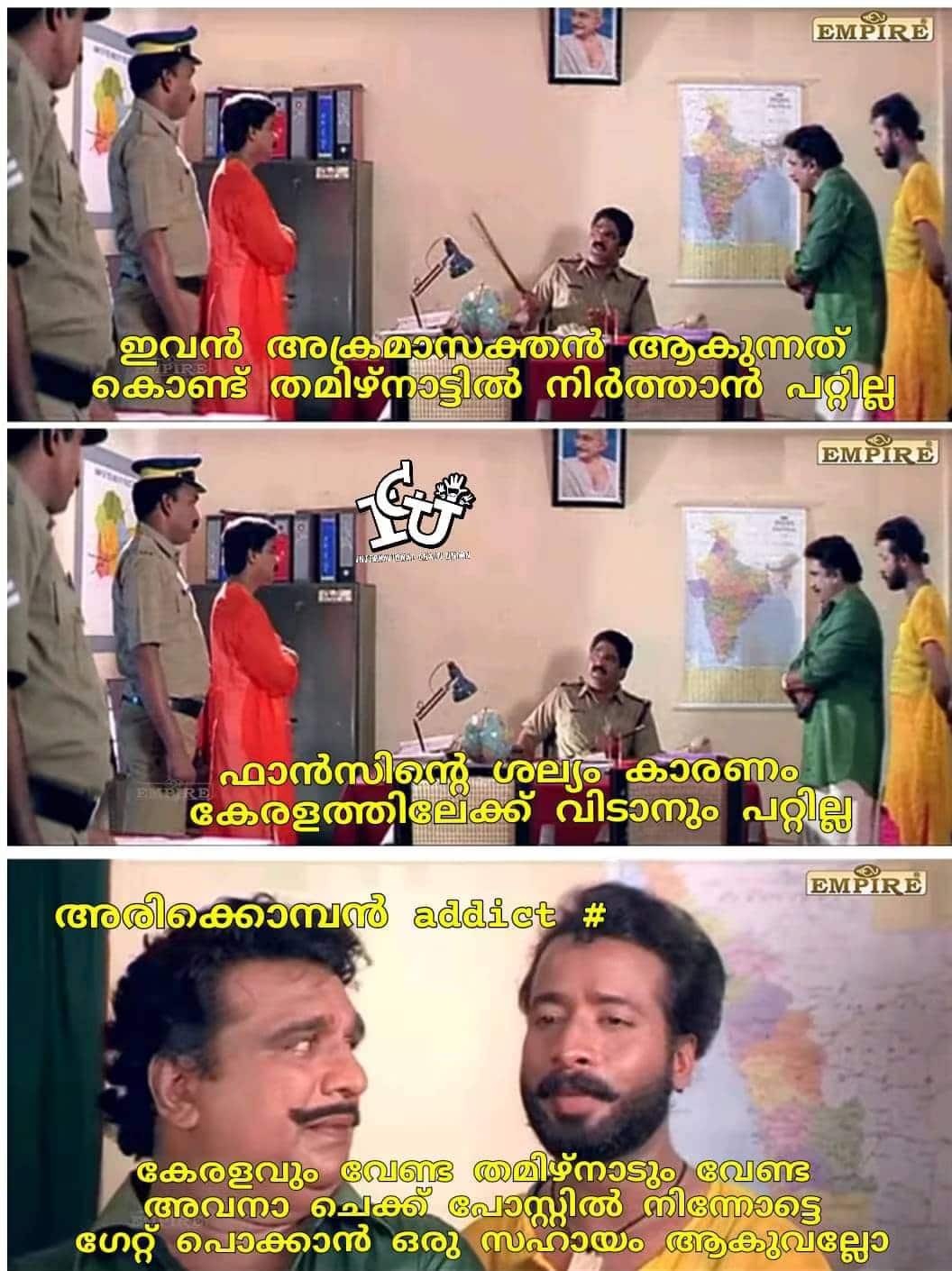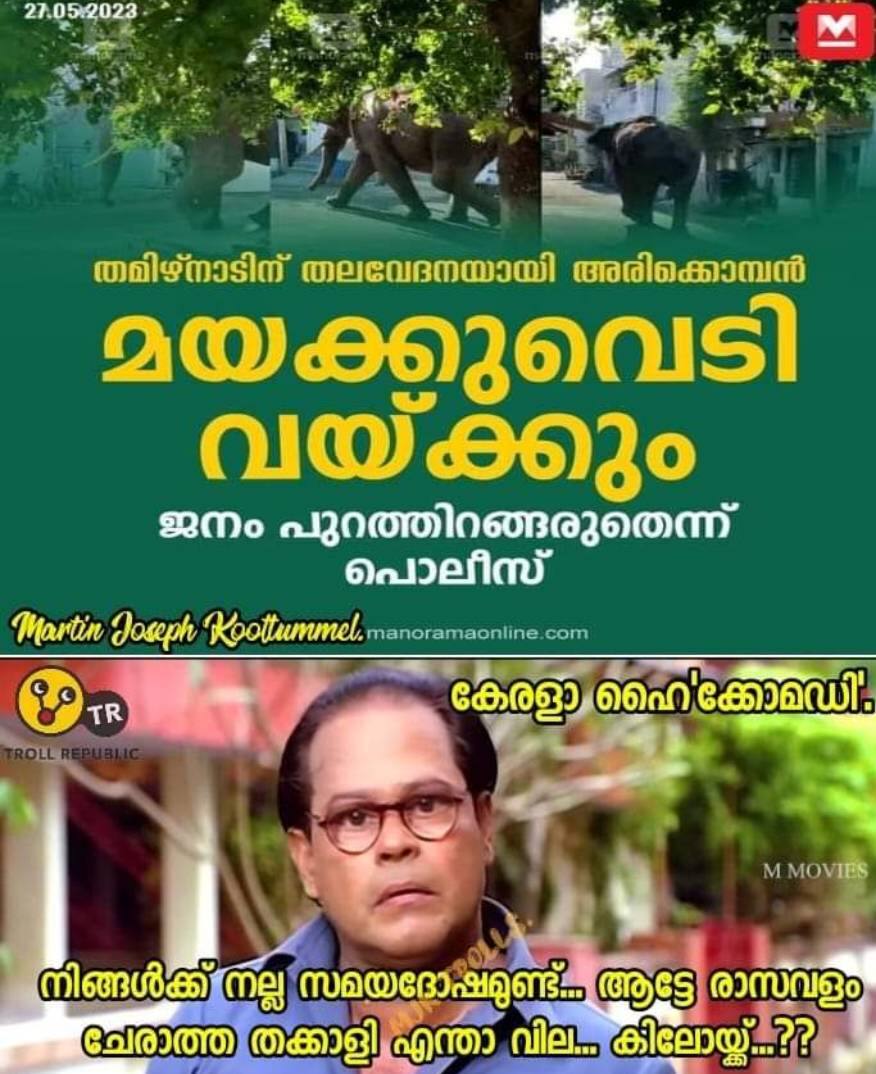 തമിഴ്നാട്ടിലെ കമ്പം ടൗണിൽ രാവിലെ മുതൽ ഭീതി പരത്തിയ കാട്ടാന അരിക്കൊമ്പന് വാര്ത്തകളിലും സമൂഹമാധ്യമങ്ങളിലും നിറഞ്ഞ് നിൽക്കുകയാണ്. അരിക്കൊമ്പന്റെ തിരിച്ചുവരവായും കേരള വനംവകുപ്പിന്റെ കഴിവില്ലായ്മയാണെന്നും തമിഴ്നാട് വനം വകുപ്പിന്റെ പ്രതിസന്ധികളും ട്രോളുകളില് നിറയുകയാണ്.