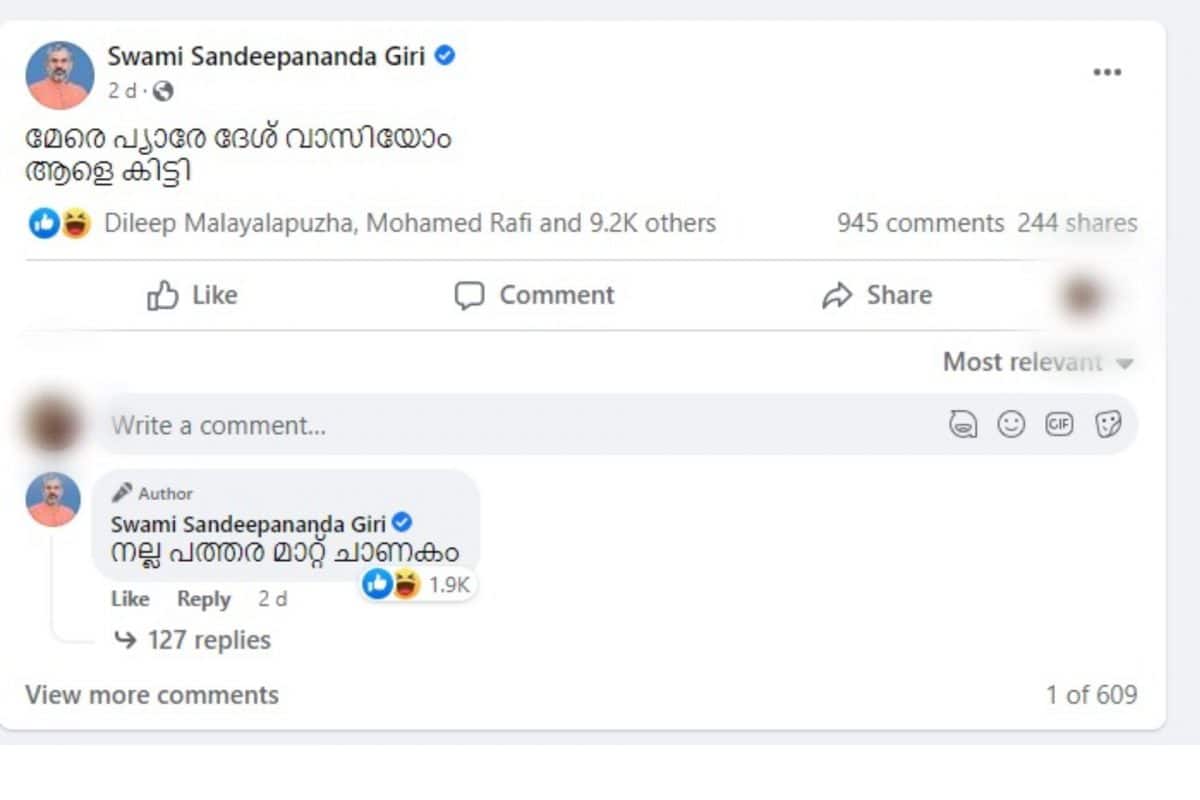 ഇതിനിടെ മരിച്ചയാളിനെ കുറിച്ച് സ്വാമി സന്ദീപാനന്ദ ഗിരിയിട്ട കമന്റിനെതിരെയും സോഷ്യൽ മീഡിയയിൽ ഒരു വിഭാഗം രംഗത്ത് വന്നു. മരിച്ചയാളെ 'പത്തരമാറ്റ് ചാണം' എന്ന് വിളിച്ചത് ശരിയായില്ലെന്നാണ് ഒരു വിഭാഗം വാദിക്കുന്നത്.
