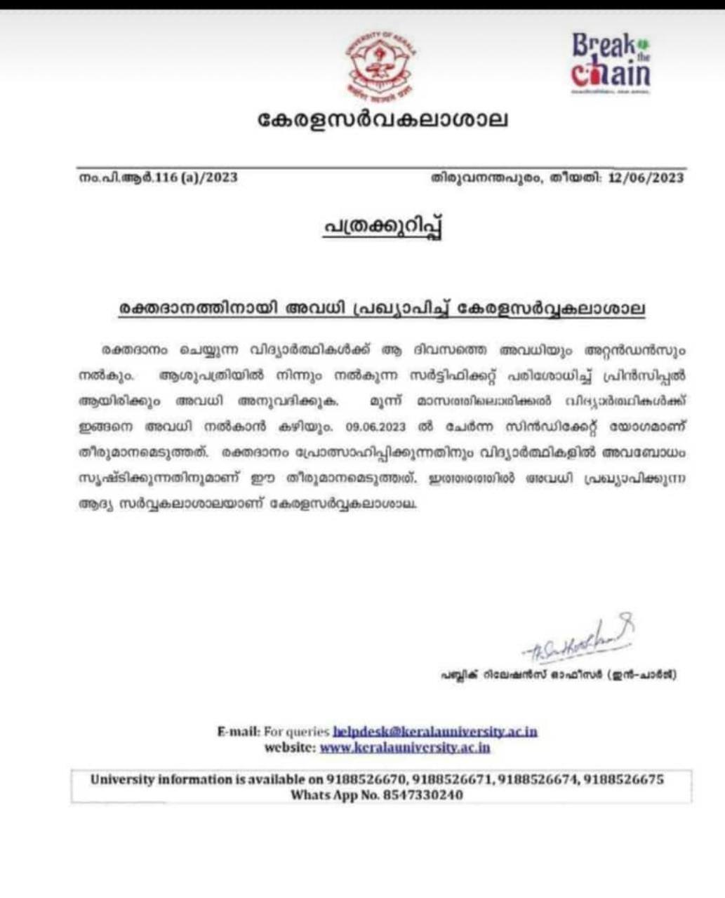 രക്തദാനത്തിന് വിദ്യാര്ഥികള്ക്ക് അവധിയുമായി കേരള സർവകലാശാല; ഇത്തരത്തിൽ അവധി നൽകുന്ന ആദ്യത്തെ സർവകലാശാല