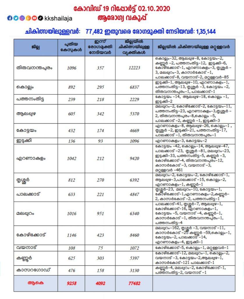 തിരുവനന്തപുരം: സംസ്ഥാനത്ത് ഇന്ന് 9258 പേര്ക്ക് കോവിഡ്-19 സ്ഥിരീകരിച്ചു. കോഴിക്കോട് 1146, തിരുവനന്തപുരം 1096, എറണാകുളം 1042, മലപ്പുറം 1016, കൊല്ലം 892, തൃശൂര് 812, പാലക്കാട് 633, കണ്ണൂര് 625, ആലപ്പുഴ 605, കാസര്ഗോഡ് 476, കോട്ടയം 432, പത്തനംതിട്ട 239, ഇടുക്കി 136, വയനാട് 108 എന്നിങ്ങനേയാണ് ജില്ലകളില് ഇന്ന് രോഗ ബാധ സ്ഥിരീകരിച്ചത്.