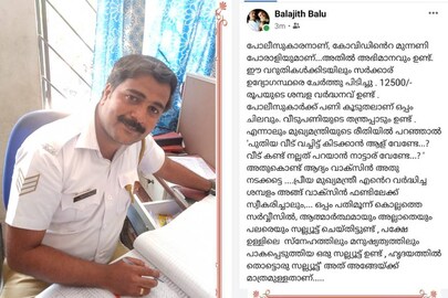 'പോലീസുകാരനാണ്, കോവിഡിന്റെ മുന്നണി പോരാളിയുമാണ്...അതില് അഭിമാനവും ഉണ്ട്. ഈ വറുതികള്ക്കിടയിലും സര്ക്കാര് ഉദ്യോഗസ്ഥരെ ചേര്ത്തു പിടിച്ചു . 12500/- രൂപയുടെ ശമ്പള വര്ദ്ധനവ് ഉണ്ട് . പോലീസുകാര്ക്ക് പണി കൂടുതലാണ് ഒപ്പം ചിലവും. വീടുപണിയുടെ തന്ത്രപ്പാടും ഉണ്ട് . എന്നാലും മുഖ്യമന്ത്രിയുടെ രീതിയില് പറഞ്ഞാല് 'പുതിയ വീട് വച്ചിട്ട് കിടക്കാന് ആള് വേണ്ടേ...? വീട് കണ്ട് നല്ലത് പറയാന് നാട്ടാര് വേണ്ടേ...? ' അതുകൊണ്ട് ആദ്യം വാക്സിന് അതു നടക്കട്ടെ ....പ്രീയ മുഖ്യമന്ത്രീ എന്െറ വര്ദ്ധിച്ച ശമ്പളം അങ്ങ് വാക്സിന് ഫണ്ടിലേക്ക് സ്വീകരിച്ചാലും,... ഒപ്പം പതിമൂന്ന് കൊല്ലത്തെ സര്വ്വീസില്, ആത്മാര്ത്ഥമായും അല്ലാതെയും പലരെയും സല്ല്യൂട്ട് ചെയ്തിട്ടുണ്ട് , പക്ഷേ ഉള്ളിലെ സ്നേഹത്തിലും മനുഷ്യത്വത്തിലും പാകപ്പെടുത്തിയ ഒരു സല്ല്യൂട്ട് ഉണ്ട് , ഹൃദയത്തില് തൊട്ടൊരു സല്ല്യൂട്ട്' അത് അങ്ങേയ്ക്ക് മാത്രമുള്ളതാണ്..... '
