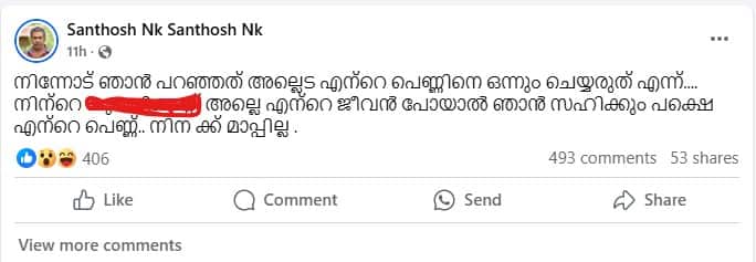വൈകിട്ട് 7.27ന് മറ്റൊരു പോസ്റ്റും കൂടി ഇയാൾ ഫേസ്ബുക്കിൽ കുറിച്ചിട്ടുണ്ട്. 'നിന്നോട് ഞാൻ പറഞ്ഞത് അല്ലെട എന്റെ പെണ്ണിനെ ഒന്നും ചെയ്യരുത് എന്ന്.... എന്റെ ജീവൻ പോയാൽ ഞാൻ സഹിക്കും പക്ഷെ എന്റെ പെണ്ണ്.. നിനക്ക് മാപ്പില്ല' എന്നായിരുന്നു രണ്ടാമത്തെ പോസ്റ്റ്.