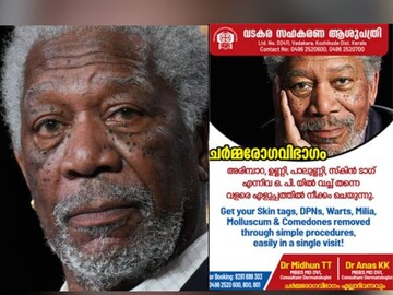 അരിമ്പാറ, പാലുണ്ണി, സ്കിന്ടാഗ് എന്നിവയുടെ ചികിത്സ നടത്തുന്ന ചര്മ്മരോഗത്തിന് വേണ്ടിയായിരുന്നു പരസ്യ ബോര്ഡ്. 'അരിമ്പാറ, ഉണ്ണി, പാലുണ്ണി, സ്കിന് ടാഗ് എന്നിവ ഒപിയില് വെച്ച് തന്നെ എളുപ്പത്തില് നീക്കം ചെയ്യുന്നു' എന്നായിരുന്നു പരസ്യം. ഈ പരസ്യ ബോര്ഡിലാണ് മോര്ഗന് ഫ്രീമാന്റെ ചിത്രം ഉള്പ്പെടുത്തിയിരിക്കുന്നത്.