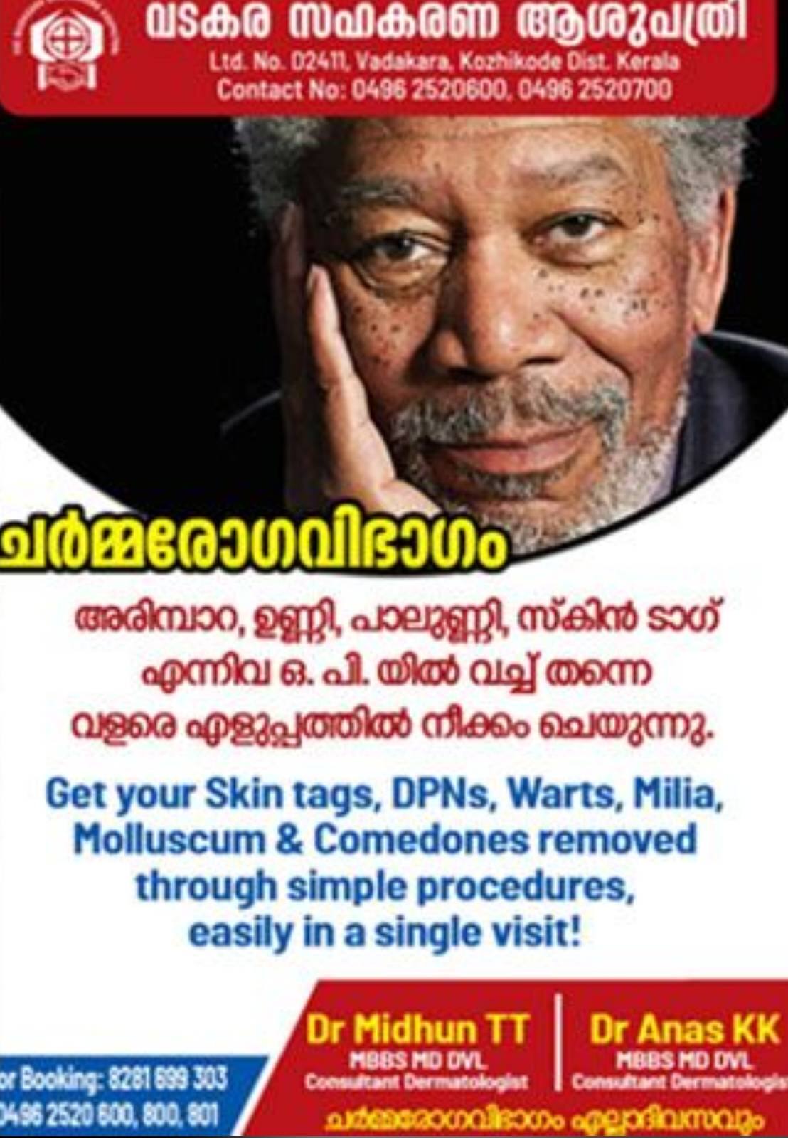 കോഴിക്കോട്: വടകര സഹകരണ ആശുപത്രിയിലെ ചര്മ്മരോഗ വിഭാഗത്തിന്റെ പരസ്യത്തില് വിഖ്യാത അമേരിക്കന് നടനും സംവിധായകനുമായ മോര്ഗന് ഫ്രീമാന്റെ ചിത്രം. ആശുപത്രിയുടെ മുന്നില്വെച്ച ഫ്ളക്സിലാണ് മോര്ഗന്റെ ചിത്രം ഉപയോഗിച്ചത്. ഫ്ളക്സ് സമൂഹമാധ്യമങ്ങളില് വൈറലായതോടെയാണ് അധികൃതര്ക്ക് വീഴ്ച മനസ്സിലായത്.