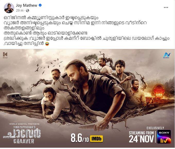 വ്യാജർ അനിഷ്ടപ്പെടുകയും ചെയ്ത സിനിമ ഇനി നിങ്ങളുടെ വീടിന്റെ അകത്തളങ്ങളിലും അതുകൊണ്ട് ആരും ഓടിയൊളിക്കേണ്ട. ശ്രദ്ധിക്കുക :വ്യാജർ ഇപ്പോൾ കമന്റ് ബോക്സിൽ ചുരുളിയിലെ ഡയലോഗ് കാച്ചും ,വായിച്ചു രസിപ്പിൻ’ – ചാവേറിന്റെ ഒടിടി റിലീസ് പ്രഖ്യാപിച്ചുകൊണ്ട് ജോയ് മാത്യു കുറിച്ചു.