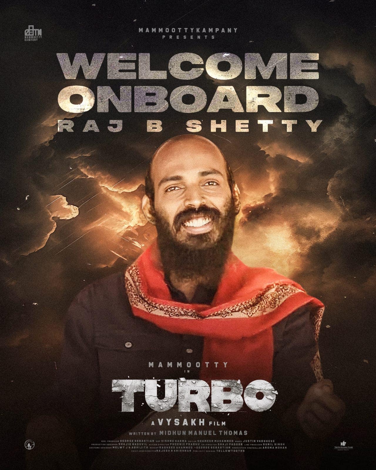 മിഥുൻ മാനുവൽ തോമസിന്റെ തിരക്കഥയിൽ, മമ്മൂട്ടിയെ നായകനാക്കി വൈശാഖ് സംവിധാനം ചെയ്യുന്ന ‘ടർബോ’യിലൂടെ കന്നഡ താരം രാജ് ബി ഷെട്ടി മലയാളത്തിലേക്കെത്തുന്നു. ചിത്രത്തിന്റെതായി പുറത്തുവിട്ട പോസ്റ്ററിലൂടെയാണ് ഇക്കാര്യം നിർമ്മാതാക്കൾ അറിയിച്ചത്. തെലുങ്ക് നടൻ സുനിലാണ് ചിത്രത്തിലെ മറ്റൊരു സുപ്രധാന വേഷം കൈകാര്യം ചെയ്യുന്നത്. താരത്തിന്റെ പോസ്റ്റർ നേരത്തെ പുറത്തുവിട്ടിരുന്നു. മറ്റ് അഭിനേതാക്കളുടെ പേരുകൾ വരും ദിവസങ്ങളിലായി വെളിപ്പെടുത്തും.