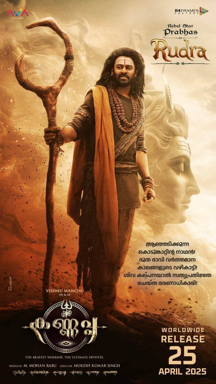 തെലുങ്ക് താരം വിഷ്ണു മഞ്ചു നായകനായ 'കണ്ണപ്പ' എന്ന ചിത്രത്തിലെ പ്രഭാസിന്റെ ക്യാരക്ടർ പോസ്റ്റർ പുറത്തുവിട്ടു. രുദ്ര എന്ന അതിഥി കഥാപാത്രമായാണ് പ്രഭാസ് ചിത്രത്തിലെത്തുന്നത്. 'ആഞ്ഞടിക്കുന്ന കൊടുങ്കാറ്റ്, ഭാവി-ഭൂത കാലങ്ങളുടെ വഴികാട്ടി, ശിവ കല്പനയാൽ സത്യപ്രതിജ്ഞ ചെയ്ത ഭരണാധികാരി,' എന്നാണ് അണിയറപ്രവർത്തകർ പ്രഭാസ് കഥാപാത്രത്തെ വിശേഷിപ്പിച്ചിരിക്കുന്നത്.